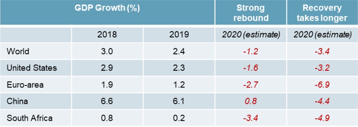 It is extremely difficult to produce a point forecast on the exact slowdown in the global economy. Stanlib’s Economics team calculated that, if the disease is brought under control during the next ten weeks, there’s a good chance we will see a strong rebound during the second half of the year. This could limit the damage to a global GDP contraction of a little over 1% in real terms. If, however, it takes longer before the current severe lockdown measures are relaxed, the global economy could shrink by between 3 and 4% in 2020. During the global financial crisis in 2008/2009 the effect was far less severe, as China still grew by nearly 10%. This helped global GDP to remain flat in real terms during that crisis. This time around they will be unable to make up for the rest of the world, as indicated in the table below: